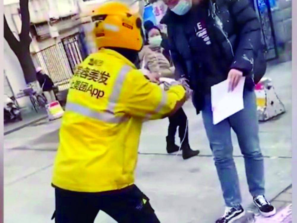 قام عامل توصيل الطعام، الذي يرتدي الزي الأصفر والخوذة، برش شاي الحليب على الرجل المرتبك وسلمه إيصال الأمر الذي تلقاه من المرأة، وكان مكتوباً فيه «لا داعي لأن تكون لطيفًا مع الأوغاد، فقط قم برش الشاي على وجهه».