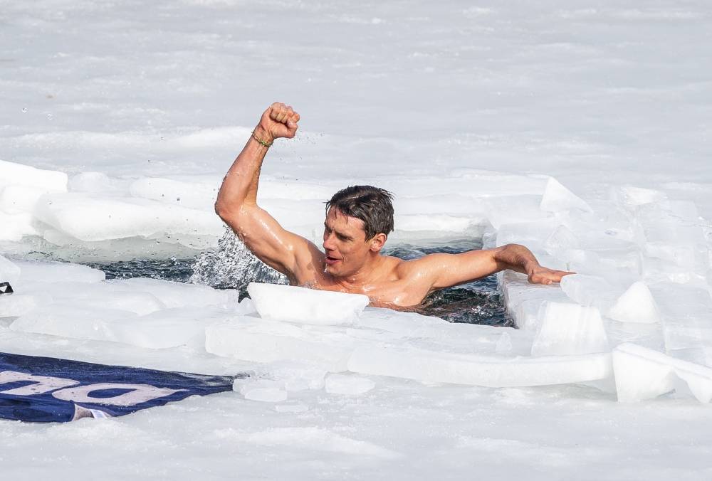 يحتفل ديفيد فينسل بعد تسجيله رقمًا قياسيًا جديدًا، في موسوعة جينيس للسباحة 80 مترًا تحت الجليد مع نفس واحد. «د ب أ»