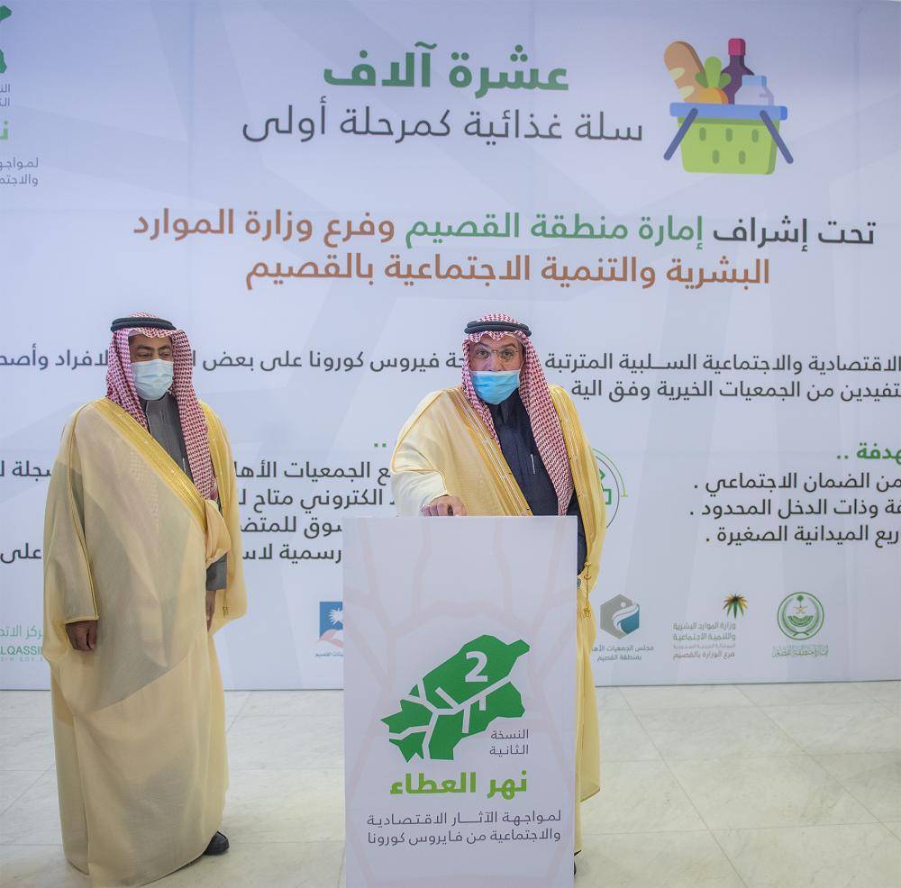 جاء ذلك خلال تدشين الأمير فيصل بن مشعل، النسخة الثانية من مبادرة #نهر_العطاء اليوم في المدخل الرئيسي بالإمارة، والتي أطلقها بإشراف فرع وزارة الموارد البشرية والتنمية الاجتماعية بالقصيم، بالشراكة مع المجلس الفرعي للجمعيات الأهلية بالقصيم، بهدف تخفيف الآثار الاقتصادية والاجتماعية السلبية المترتبة لجائحة فيروس كورونا على بعض الأسر والأفراد وأصحاب المشاريع الصغيرة، وذلك وفق آلية محددة بالتعاون مع الجمعيات الأهلية بالمنطقة ولجان التنمية الاجتماعية ورابطة التطوع بالمنطقة ومجلس شباب القصيم ومجلس فتيات القصيم، بحضور عدد من المسؤولين في الجهات المعنية بالمنطقة.