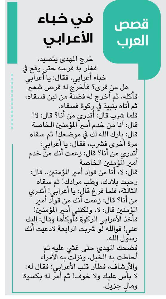 فضحك المهدي حتى غشي عليه ثم أحاطت به الخيل، ونزلت به الأمراء والأرشاف، فطار قلب الأعرابي؛ فقال له: لا بأس عليك ولا خوف! ثم أمر له بكسوة ومالٍ جزيل.