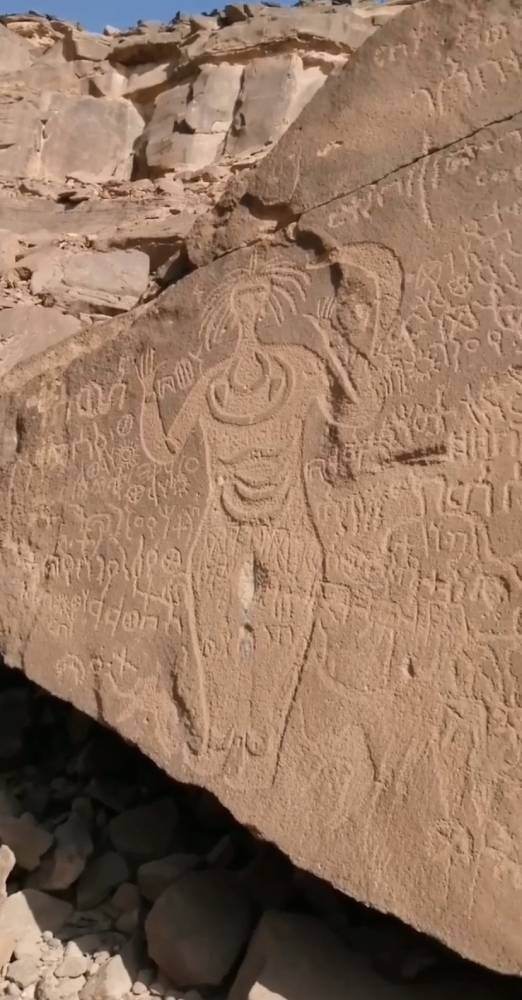 يقول الباحث التاريخي محمد حريش آل مستنير: إن اللوحة الفنية الصخرية تعود إلى نحو 4 آلاف عام، وبالتحديد للعصر البرونزي أو العصر الحديدي، بحسب الدراسات التي أجريت عليها، فالرجل المحارب والهلال يعتبران من المعبودات النجمية كالشمس والقمر وكوكب الزهرة، كما يوجد رسم الوعل الذي يرمز إلى أحد الآلهة، ويدعى عثتر، وجميع الكتابات الصخرية سواء بالخط المسند والخط الثمودي عقبة الرسم، حيث جاءت في فترات لاحقة، لأن الرسم سبقها بمدة زمنية، وقد تم اكتشاف هذا المكان من قبل أحد المصورين والسياح الأجانب منذ 25 عاما تقريبا، وتمت دراستها من قبل هيئة السياحة والآثار بمحافظة يدمة، واختتم آل مستنير حديثه: يحتاج الموقع إلى دراسات علمية حديثة ومكثفة تسلط الضوء على تاريخه ومدلولات هذه النقوش والرسوم الصخرية المهمة، فضلا عن ضرورة استغلاله كمصدر جذب سياحي.