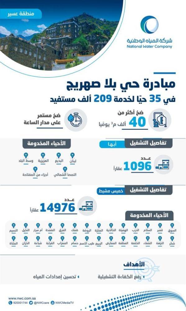 وأوضح رئيس القطاع الجنوبي بشركة المياه الوطنية المهندس عبد الله بن سعيد العمري، أن المبادرة ستنطلق في 7 أحياء في مدينة أبها، هي: «لبنان والبديع والعزيزية، ووسط البلد والنمصا الشمالي، وأجزاء من المفتاحة»، لتشمل 1096 عقارًا بالضخ المستمر، إضافة إلى 28 حيًا في محافظة خميس مشيط، وهي: «السوق وقمبر والسلام، والدرب والهميلة والخالدية، والمنتزه والروضة وضمك، والعرق والصمدة وأم سرار، والنخيل والنسيم وشكر، والنزهة والشفاء والخلصة، والعطفة والمعارض والربيع، وطيب الاسم وحسام والمعزاب، والغرابة وشباعة والخزان والمثناة»، وذلك لخدمة 14976 عقارًا بالضخ المستمر.