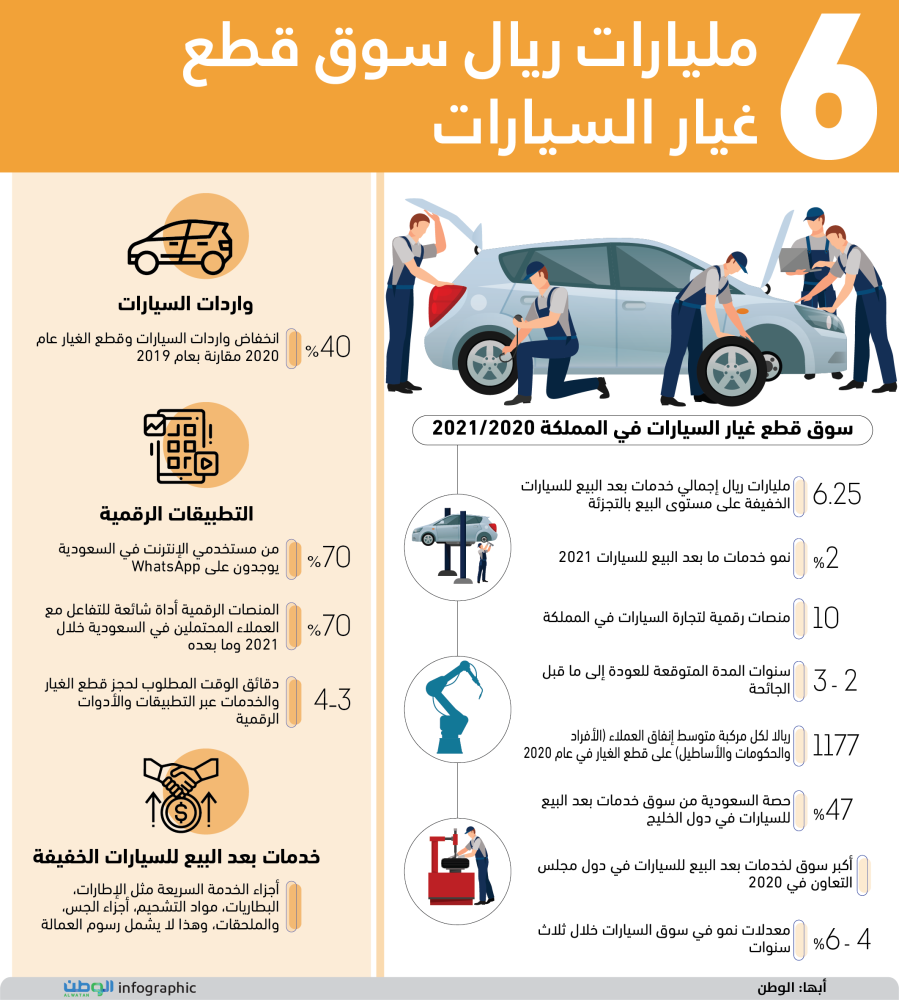 توقعت دراسة متخصصة صادرة عن (Frost & Sullivan) العالمية أن تشهد سوق قطع غيار السيارات في المملكة نموا نسبته 2% بنهاية العام الحالي 2021. وقالت الدراسة، إن سوق قطع غيار السيارات وخدمات بعد البيع في المملكة تعد الأكبر في المنطقة، متوقعة أن يحتاج بين عامين وثلاثة أعوام للتعافي من تأثيرات جائحة كــورونـا، وستكون أكثر رقمنة وشفافية وتنظيما. وخلصت الدراسة إلى أن سوق خمات بعد البيع في المملكة لقطاع السيارات وقطع الغيار سوف يصبح أكثر اعتمادية على الرقمنة وأكثر شفافية وأكثر تنظيما.