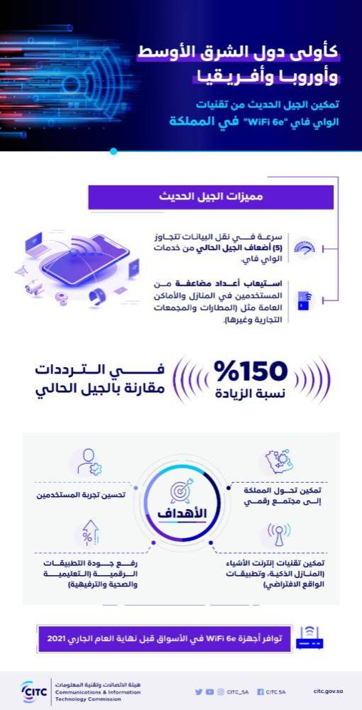 كما أوضحت الهيئة أن سمات الجيل الحديث من تقنيات الـ«واي فاي» تسهم في تمكين تقنيات إنترنت الأشياء، والمنازل الذكية، وتطبيقات الواقع الافتراضي، إلى جانب رفع جودة مختلف التطبيقات الرقمية في المجالات التعليمية والصحية والترفيهية، وربط شبكات الـ«واي فاي» بالألياف الضوئية لتوفير سرعة نقل بيانات أعلى. يشار إلى أن إطلاق هذا الجيل الحديث من تقنية الـ«واي فاي» يأتي في إطار تنفيذ خطة «هيئة الاتصالات» للاستخدام التجاري والمبتكر للطيف الترددي في المملكة (2021-2023) التي أعلنت عنها مطلع هذا الأسبوع؛ بهدف تمكين التقنيات اللاسلكية الحديثة، وإيجاد البيئة المناسبة لتبنيها، مثل: تقنية الجيل الخامس، والنطاق العريض عبر الأقمار الصناعية، وإنترنت الأشياء، وأنظمة النقل الذكي، وغيرها.