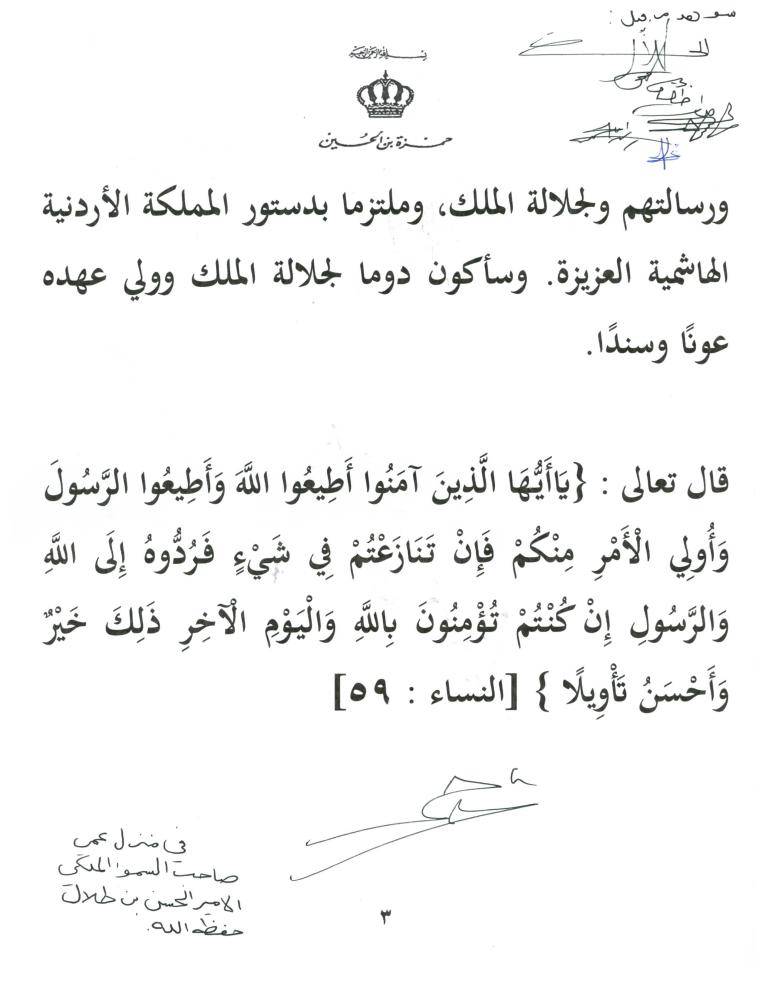 وفي ضوء تطورات اليومين الماضيين، فإنني أضع نفسي بين يدي جلالة الملك، مؤكدا أنني سأبقى على عهد الآباء والأجداد، وفيا لإرثهم، سائرا على دربهم، مخلصا لمسيرتهم ورسالتهم ولجلالة الملك، وملتزما بدستور المملكة الأردنية الهاشمية العزيزة. وسأكون دوما لجلالة الملك وولي عهده عونا وسندا".