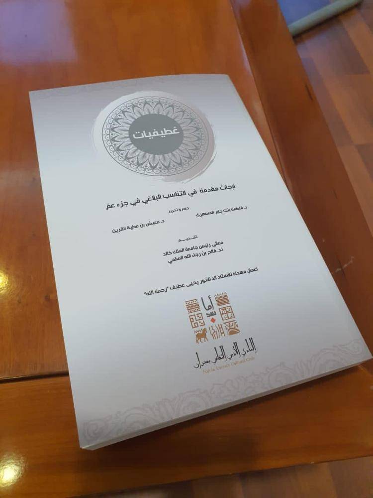 وأضاف آل مرضمة، أن هذه المبادرة الجميلة تمت مناقشتها مع طلاب وطالبات الدكتوراه، حيث تناولت أبحاث الكتاب القيمة البلاغية للتناسب البلاغي في القرآن الكريم، وقام النادي بطباعة الكتاب بالتعاون مع صاحبي المبادرة الدكتور معيض القرني، والدكتورة فاطمة المسهري، اللذين قاما على جمع محتوى الكتاب وتحريره.