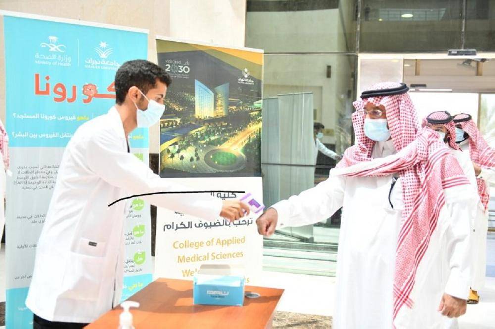 وأضاف السبيعي أن عمادة التعلم الإلكتروني والتعليم عن بُعد حرصت على تهيئة أعضاء هيئة التدريس والطلاب من خلال تقديم البرامج التدريبية؛ لتعزيز المهارات الإلكترونية التي تضمن تسيير العملية التعليمية بكفاءة عالية، منوهاً إلى برنامج «تعزيز» التدريبي على أداء الاختبارات الإلكترونية الذي قدمته العمادة، واشتمل على 11 دورة تدريبية لأعضاء هيئة التدريس والطلاب، واستفاد منها أكثر من 650 مستفيدًا. وأكد رئيس الجامعة على مضاعفة جهود الجامعة في الحد من انتشار فيروس كورونا من خلال تكثيف الإجراءات الاحترازية، وتعقيم المعامل والقاعات الدراسية لطلاب المواد التطبيقية، حيث يشترط على الطلاب تحميل التطبيقات التي أوصت بها وزارة الصحة «توكلنا- تباعد- صحتي- تطمن»، مع إجراء الجامعة لعمليات الفرز البصري وتحقيق التباعد الجسدي داخل المعامل ولبس الكمامة.