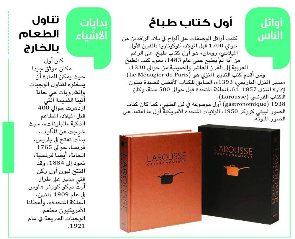 ومن أقدم كتب التدبير المنزلي هو (Le Ménagier de Paris) «مدبر المنزل الباريسي، 1393»، السابق للكتاب الأفضل للسيدة بيتون لإدارة المنزل 1857-61، المملكة المتحدة قبل حوالي 500 سنة، وكان الكتاب الفرنسي (Larousse). gastronomique) 1938) أول موسوعة في فن الطهي، كما كان كتاب الصور لبيتي كروكر 1950، الولايات المتحدة الأمريكية أول ما اعتمد على الصور الملونة.