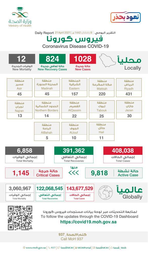 وبينت الإحصائية أن إجمالي عدد الإصابات في المملكة بلغ 408038، فيما بلغ عدد حالات التعافي 391362 حالة.