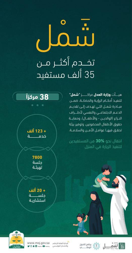 وقدمت المراكز نحو 123 ألف خدمة ما بين رؤية وزيارة ونقل وحضانة، كما يبلغ عدد المستفيدين من مبادرة «شمل» أكثر من 35 ألف مستفيد حتى الآن.
