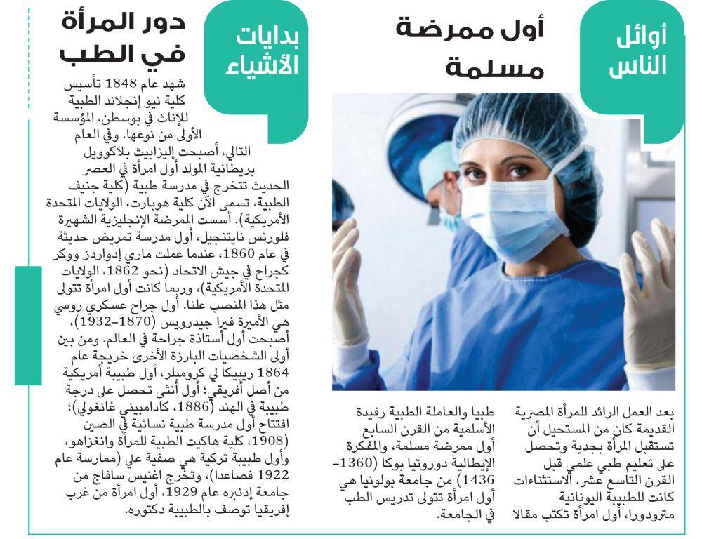 شهد عام 1848 تأسيس كلية نيو إنجلاند الطبية للإناث في بوسطن، المؤسسة الأولى من نوعها. وفي العام التالي، أصبحت إليزابيث بلاكوويل بريطانية المولد أول امرأة في العصر الحديث تتخرج في مدرسة طبية (كلية جنيف الطبية، تسمى الآن كلية هوبارت، الولايات المتحدة الأمريكية). أسست الممرضة الإنجليزية الشهيرة فلورنس نايتنجيل، أول مدرسة تمريض حديثة في عام 1860، عندما عملت ماري إدواردز ووكر كجراح في جيش الاتحاد (نحو 1862، الولايات المتحدة الأمريكية)، وربما كانت أول امرأة تتولى مثل هذا المنصب علنا. أول جراح عسكري روسي هي الأميرة فيرا جيدرويس (1870-1932)، أصبحت أول أستاذة جراحة في العالم. ومن بين أولى الشخصيات البارزة الأخرى خريجة عام 1864 ريبيكا لي كرومبلر، أول طبيبة أمريكية من أصل أفريقي؛ أول أنثى تحصل على درجة طبيبة في الهند (1886، كادامبيني غانغولي)؛ افتتاح أول مدرسة طبية نسائية في الصين (1908، كلية هاكيت الطبية للمرأة وانغزاهو، وأول طبيبة تركية هي صفية علي (ممارسة عام 1922 فصاعدا)، وتخرج اغنيس سافاج من جامعة إدنبره عام 1929، أول امرأة من غرب إفريقيا توصف بالطبيبة دكتوره.