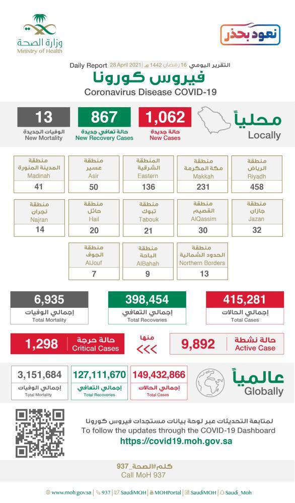 وفي نفس السياق أعلنت الصحة إحصائية جديدة لمستجدات كورونا في المملكة خلال ال24 ساعة الماضية تضمنت تسجيل (1062) حالة مؤكدة وتعافي(867) حالة فيما بلغ عدد الحالات النشطة (9892) منها (1298) حالة حرجة.