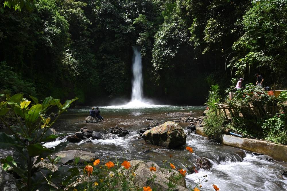 يزور الناس شلال Sengkuang، أحد مناطق الجذب السياحي بـ«كيباهيانج» في إندونيسيا. (أ ف ب)