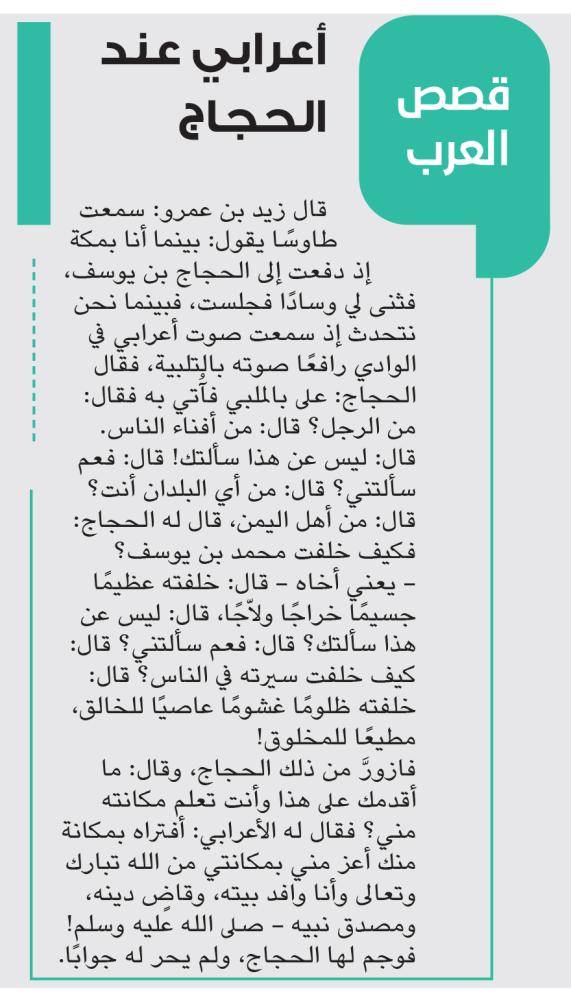 قال: ليس عن هذا سألتك ! قال: فعم سألتني؟ قال: من أي البلدان أنت؟ قال: من أهل اليمن، قال له الحجاج: فكيف خلفت محمد بن يوسف؟ - يعني أخاه - قال: خلفته عظيمًا جسيمًا خراجًا ولاّجًا، قال: ليس عن هذا سألتك؟ قال: فعم سألتني؟ قال: كيف خلفت سيرته في الناس؟ قال: خلفته ظلومًا غشومًا عاصيًا للخالق، مطيعًا للمخلوق ! فازورَّ من ذلك الحجاج، وقال: ما أقدمك على هذا وأنت تعلم مكانته مني؟ فقال له الأعرابي: أفتراه بمكانة منك أعز مني بمكانتي من الله تبارك وتعالى وأنا وافد بيته، وقاضٍ دينه، ومصدق نبيه - صلى الله عليه وسلم ! فوجم لها الحجاج، ولم يحر له جوابًا.
