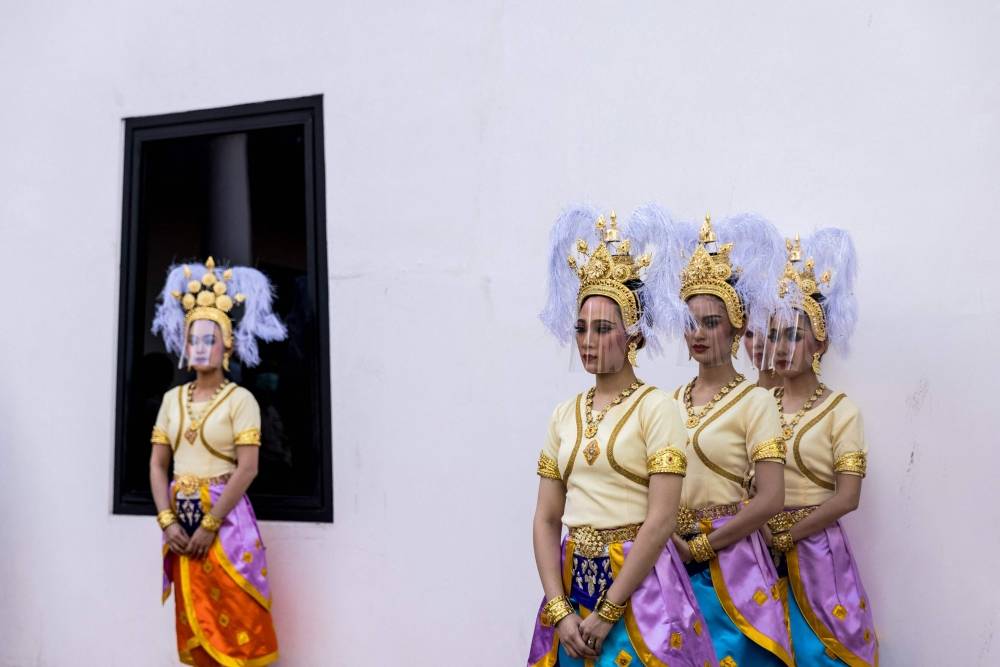 راقصات تايلانديات خلال حدث للاحتفال بعودة عتبتين قديمتين من الحجر الرملي، وعوارض دعم مقدسة من الحجر الرملي تعود لأواخر القرن الـ10 أو الـ11، في متحف بانكوك الوطني. (أ ف ب)
