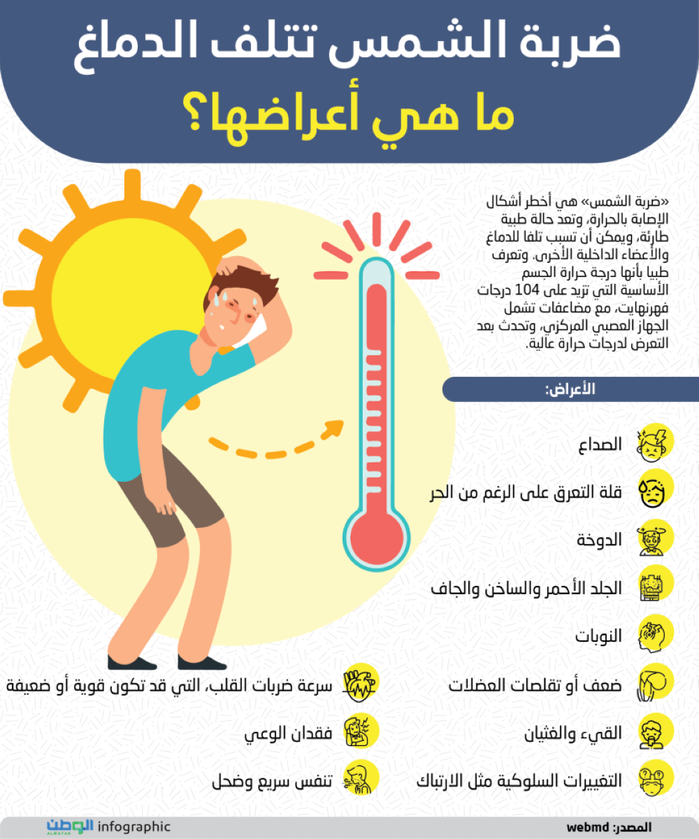«ضربة الشمس» هي أخطر أشكال الإصابة بالحرارة، وتعد حالة طبية طارئة، ويمكن أن تسبب تلفا للدماغ والأعضاء الداخلية الأخرى. وتعرف طبيا بأنها درجة حرارة الجسم الأساسية التي تزيد على 104 درجات فهرنهايت، مع مضاعفات تشمل الجهاز العصبي المركزي، وتحدث بعد التعرض لدرجات حرارة عالية.