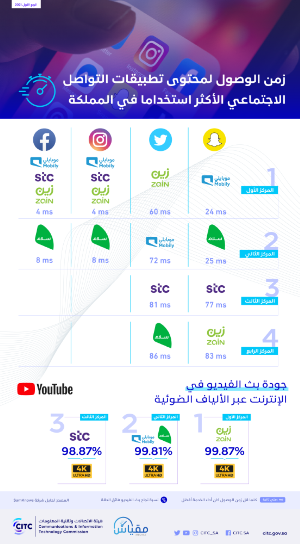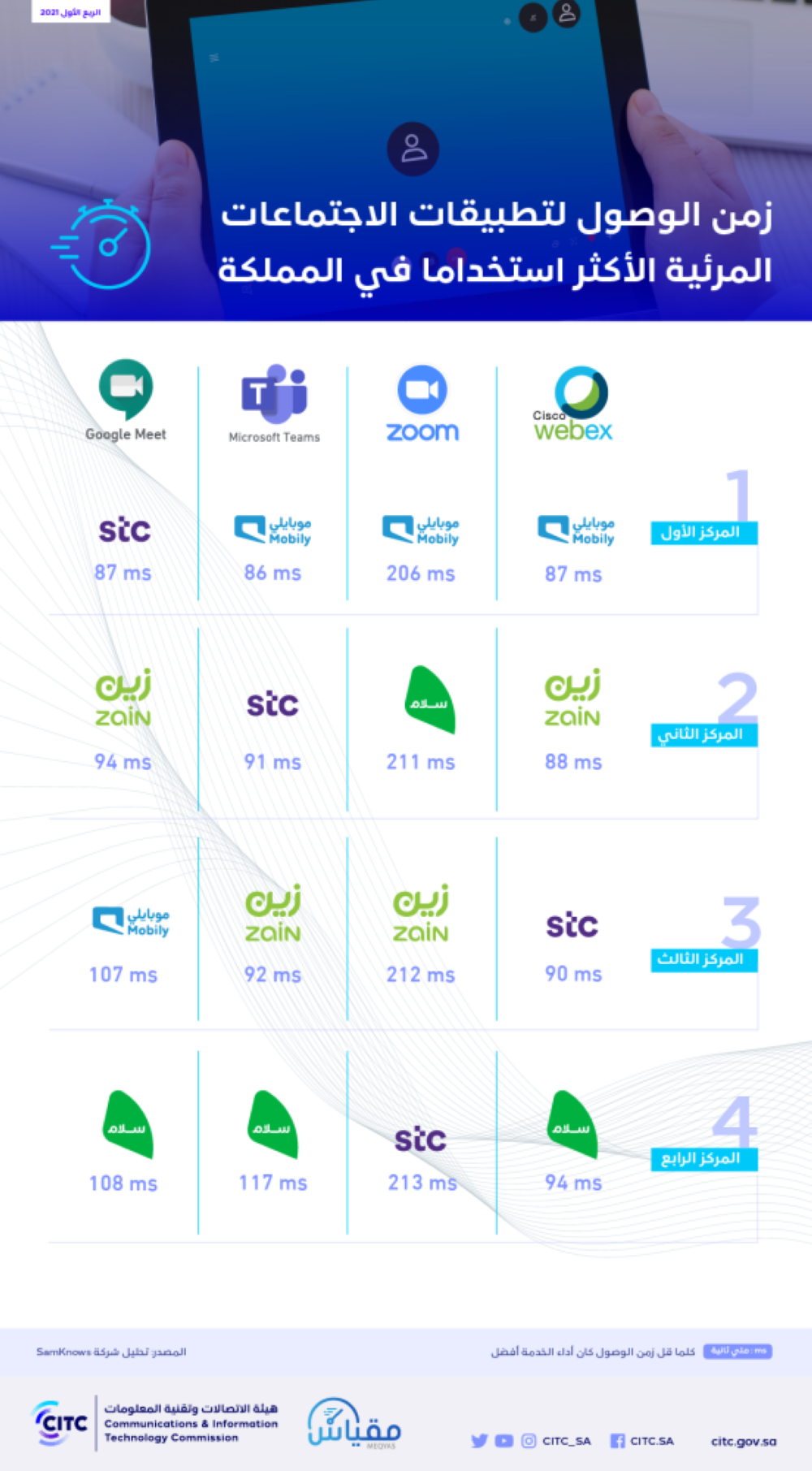 أصدرت هيئة الاتصالات وتقنية المعلومات التقرير الربعي لمؤشرات سرعة الإنترنت وسرعة الوصول للمحتوى الرقمي في المملكة «مقياس»، الذي كشف في نسخة الربع الأول من عام 2021، عن تسجيل شركة «موبايلي» لأفضل سرعة وصول لمحتوى تطبيق (سناب شات)، فيما سجلت شركة «زين» أفضل سرعة وصول لتطبيق (تويتر)، وتسجيل كل من شركة (STC، وموبايلي، وزين) أفضل سرعة وصول لتطبيقي (فيسبوك، وإنستقرام). وكشف التقرير عن تصدر شركة «زين» لتصنيف مقدمي خدمات الاتصالات في جودة بث الفيديو في الإنترنت عبر الألياف الضوئية عبر منصة «يوتيوب» بنسبة نجاح تصل إلى 99.87%، وفي المركز الثاني كل من شركتي: موبايلي، وسلام، جاءت بعدها شركة «STC» في المركز الثالث. كما أظهر التقرير الربعي تصدّر شركة «موبايلي» قائمة سرعة الوصول لتطبيقات الاجتماعات المرئية الأكثر استخدامًا في المملكة، بعد تسجيلها أفضل سرعة وصول لتطبيقات: (زوم، مايكروسفت تيمز، ويبكس)، وتصدّرت «STC» قائمة زمن الوصول لتطبيقات الاجتماعات المرئية الأكثر استخداما في المملكة لتطبيق (جوجل ميت) خلال الربع الأول من عام 2021.