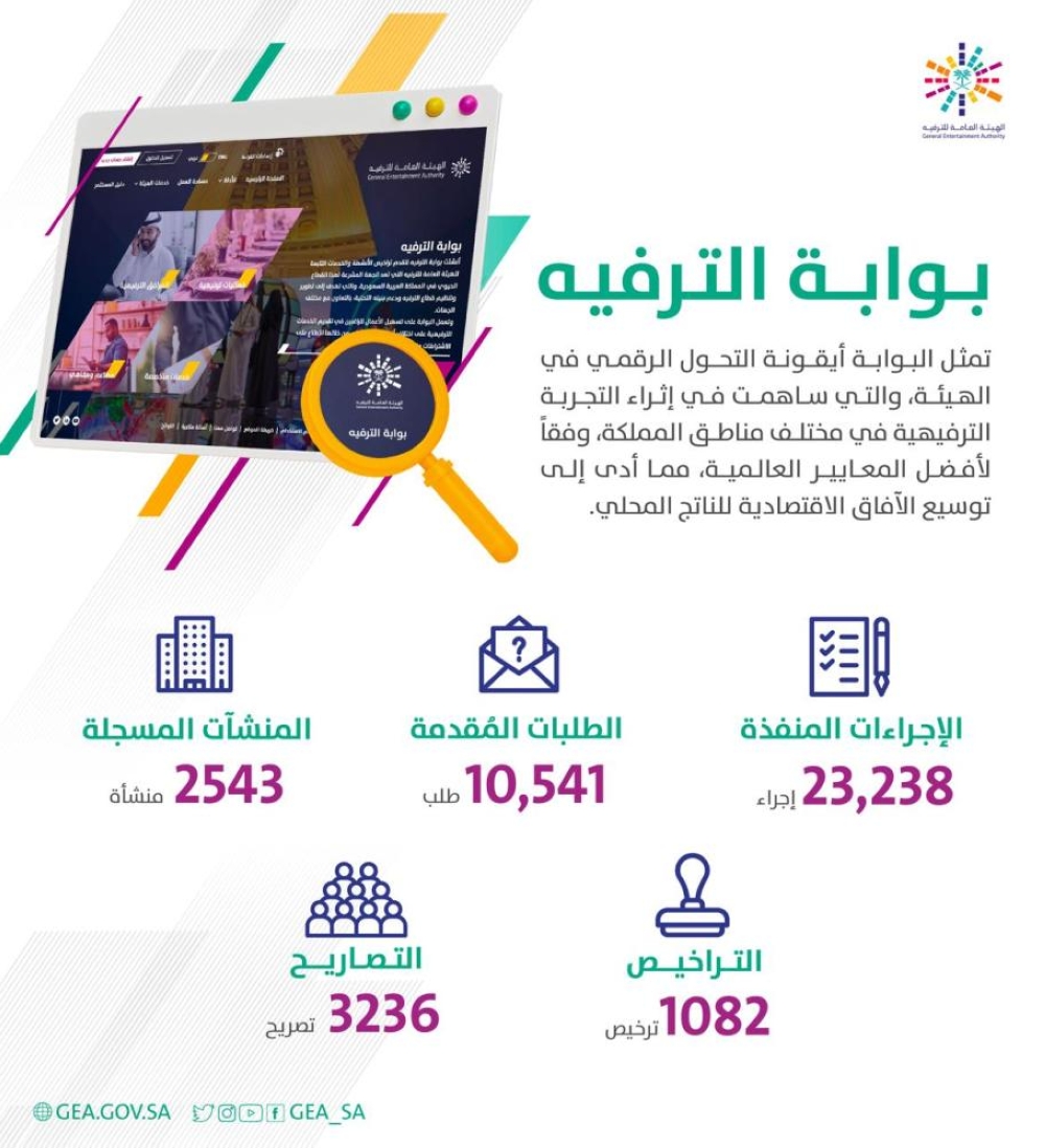 وبلغ عدد التراخيص التي أصدرتها "بوابة الترفيه" منذ انطلاقتها وحتى اليوم للمستثمرين ورواد الأعمال والشركات 1,082 ترخيصًا موزعة على النحو التالي: 18 لمدن الملاهي، و195 للمراكز الترفيهية، و3 لمرافق الفعاليات الترفيهية، و418 لإدارة وتطوير المواهب الفنية والترفيهية و448 لتشغيل المرافق الترفيهية، فيما وصل عدد التصاريح التي منحتها "بوابة الترفيه" حتى اليوم إلى 3236 تصريحا.