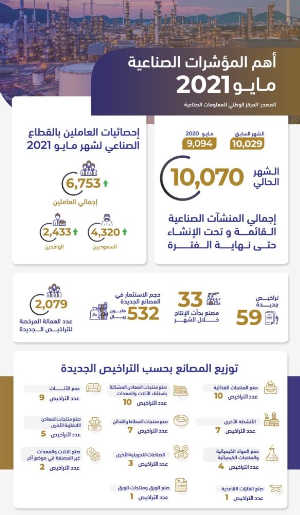 بيّن تقرير المركز الوطني للمعلومات الصناعية، أن عدد المنشآت الصناعية القائمة بنهاية شهر مايو، قد وصل إلى 10,070 مصنعاً، وبلغ إجمالي حجم الاستثمارات فيها ما يتجاوز 1.134 تريليون ريال. وتصدر وزارة الصناعة والثروة المعدنية، عبر المركز الوطني للمعلومات الصناعية بشكل شهري، أهم المؤشرات لحركة النشاط الصناعي في المملكة، إضافة إلى الكشف عن حجم التغيير الذي يشهده القطاع في الاستثمارات الصناعية الجديدة، وحجم الوظائف التي يجذبها القطاع.