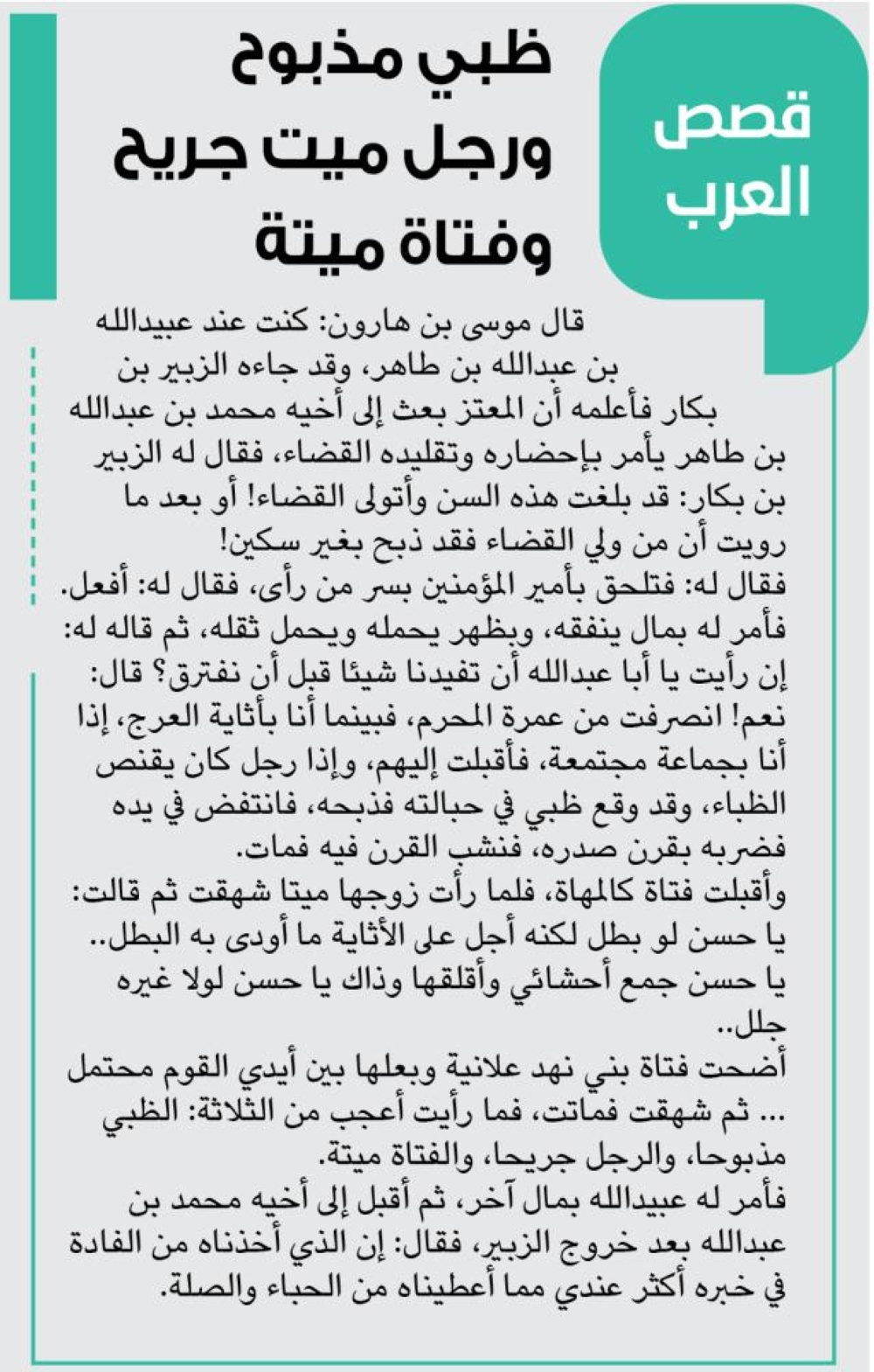 أضحت فتاة بنى نهد علانية وبعلها بين أيدى القوم محتمل ثم شهقت فماتت، فما رأيت أعجب من الثلاثة: الظبى مذبوحا، والرجل جريحا، والفتاة ميتة.
