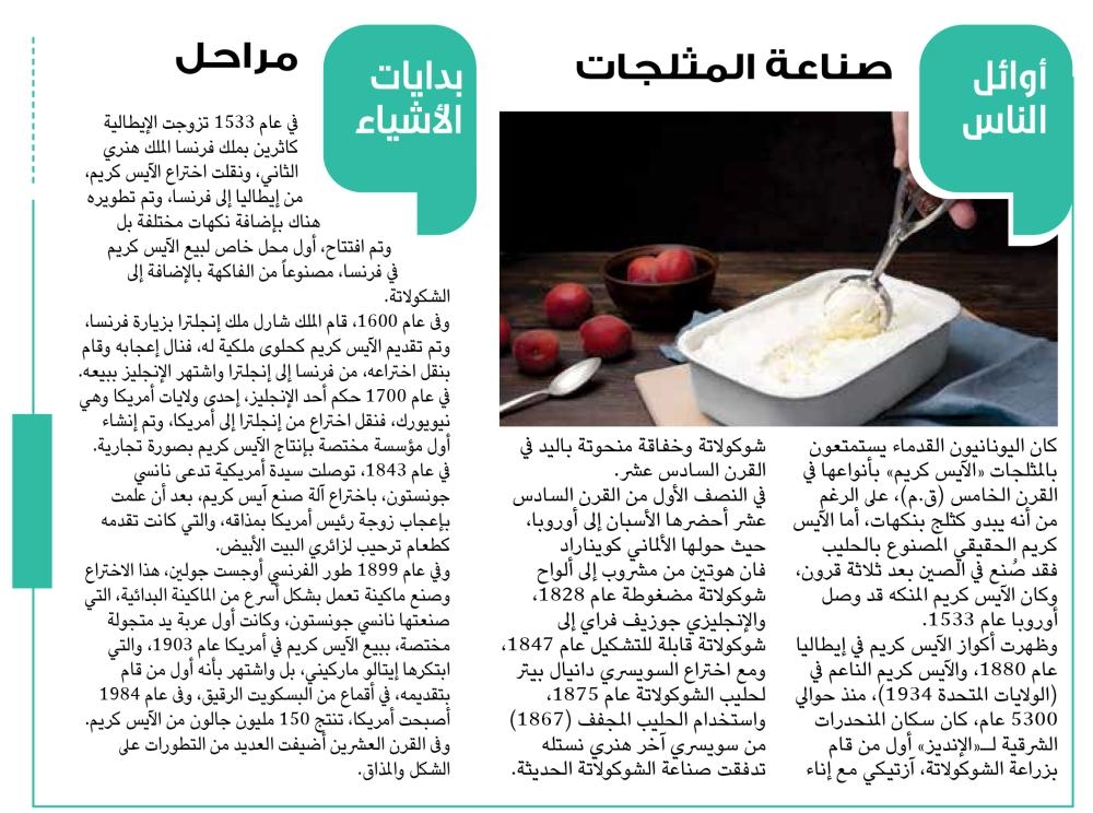 كان اليونانيون القدماء يستمتعون بالمثلجات «الآيس كريم» بأنواعها في القرن الخامس (ق.م)، على الرغم من أنه يبدو كثلج بنكهات، أما الآيس كريم الحقيقي المصنوع بالحليب فقد صُنع في الصين بعد ثلاثة قرون، وكان الآيس كريم المنكه قد وصل أوروبا عام 1533.