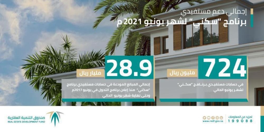 وأوضح الرئيس التنفيذي للصندوق منصور بن ماضي، أن إجمالي الدعم لشهر يونيو تجاوز 724 مليون ريال، وخُصص بالكامل لدعم أرباح عقود قروض التمويل العقاري لمستفيدي الدعم السكني من الأسر السعودية لشراء وحدات سكنية تحت الإنشاء أو جاهزة، والأسر المستفيدة من خيار البناء الذاتي لمن يمتلكون أراضيهم، مشيرًا إلى أن إجمالي المبالغ المودعة في حسابات مستفيدي «سكني» منذ إعلان برنامج التحول في يونيو 2017م وحتى نهاية شهر يونيو الجاري بلغت نحو 28.9 مليار ريال.