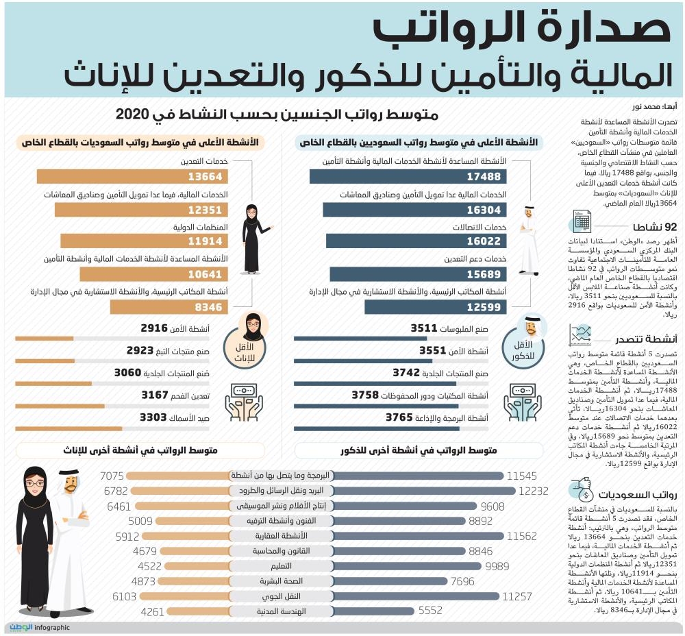 تصدرت 5 أنشطة قائمة متوسط رواتب السعوديين بالقطاع الخاص، وهي الأنشطة المساعدة لأنشطة الخدمات المالية، وأنشطة التأمين بمتوسط 17488ريالا، ثم أنشطة الخدمات المالية، فيما عدا تمويل التأمين وصناديق المعاشات بنحو 16304ريالا، تأتي بعدهما خدمات الاتصالات عند متوسط 16022ريالا ثم أنشطة خدمات دعم التعدين بمتوسط نحو 15689ريالا، وفي المرتبة الخامسة جاءت أنشطة المكاتب الرئيسية، والأنشطة الاستشارية في مجال الإدارة بواقع 12599ريالا.