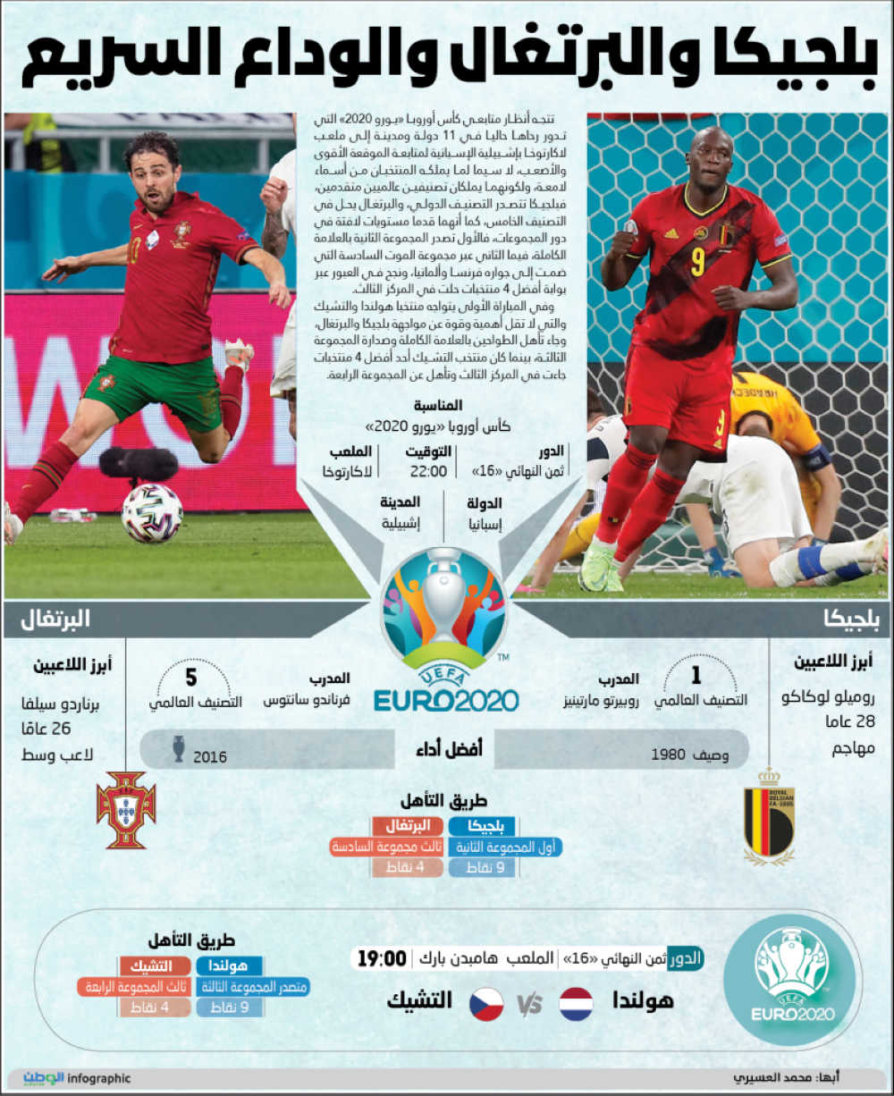وفي المباراة الأولى يتواجه منتخبا هولندا والتشيك والتي لا تقل أهمية وقوة عن مواجهة بلجيكا والبرتغال، وجاء تأهل الطواحين بالعلامة الكاملة وصدارة المجموعة الثالثة، بينما كان منتخب التشيك أحد أفضل 4 منتخبات جاءت في المركز الثالث وتأهل عن المجموعة الرابعة.