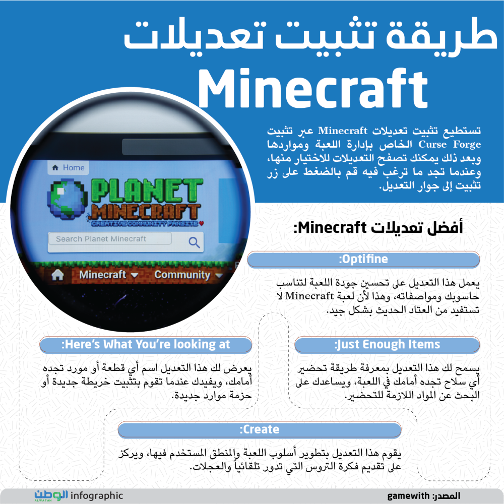 Optifine: يعمل هذا التعديل على تحسين جودة اللعبة لتناسب حاسوبك ومواصفاته، وهذا لأن لعبة Minecraft لا تستفيد من العتاد الحديث بشكل جيد.