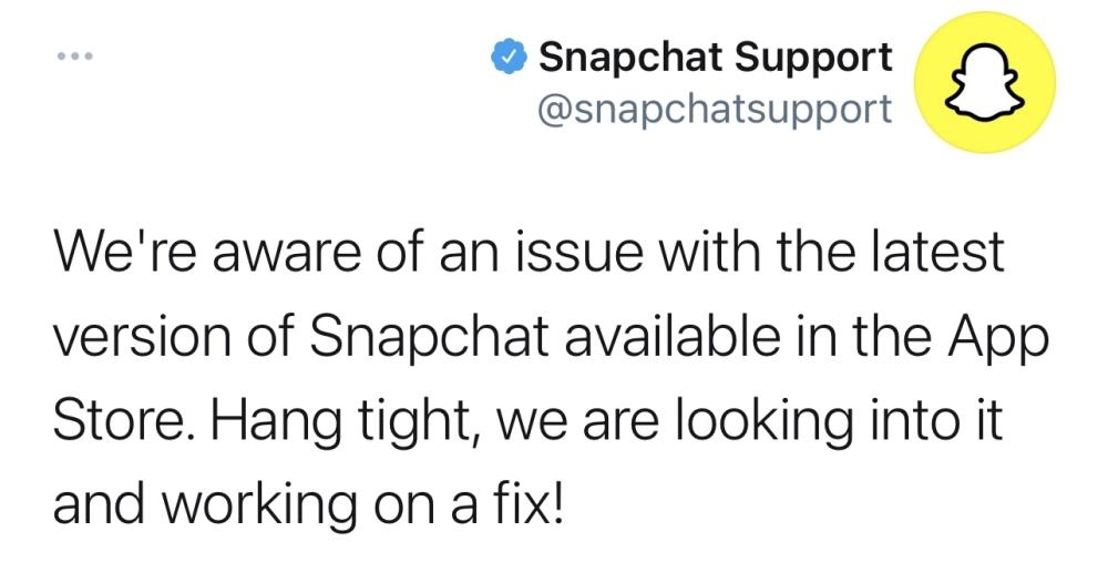 وكانت الشركة تعمل على إصلاح مشكلة في التحديث الجديد. وقالت في تغريدة باللغة الإنجليزية نشرها حساب الدعم الخاص بخدمة التراسل الشهيرة: «نحن على علم بوجود مشكلة في أحدث إصدار من SnapChat المتوفر في متجر (App Store)... نحن نبحث في الأمر، ونعمل على إصلاحه!».