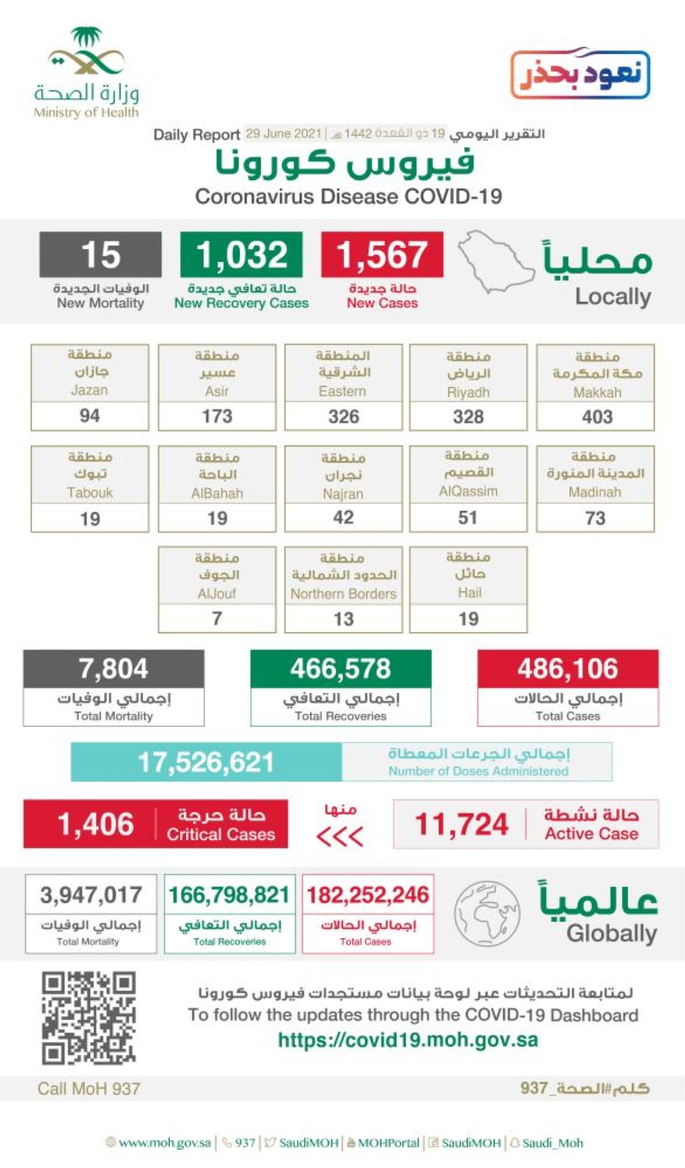 وارتفع عدد الحالات من 1318 المسجلة يوم الاثنين إلى 1567 حالة، بزيادة 249 حالة، في حين لا تزال منطة مكة المكرمة تسجل أكثر الحالات، وسجلت اليوم 403 حالات.
