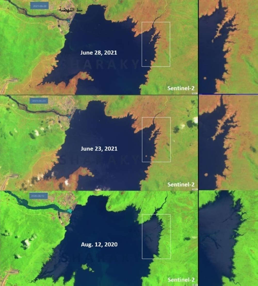 وأوضح «شراقي» أن الصور أظهرت ارتفاع منسوب البحيرة 565 مترا، أى بنحو نصف متر عن الأسبوع الماضي، وأن كميات مياه الأمطار والتصريف من بحيرة «تانا» التي تصل إلى سد النهضة حاليا تقدر بنحو 150 مليون متر مكعب، يمر منها عبر فتحتي السد نحو 50 - 60 مليون متر مكعب، ويحجز الباقى نتيجة رفع خرسانة الممر الأوسط.