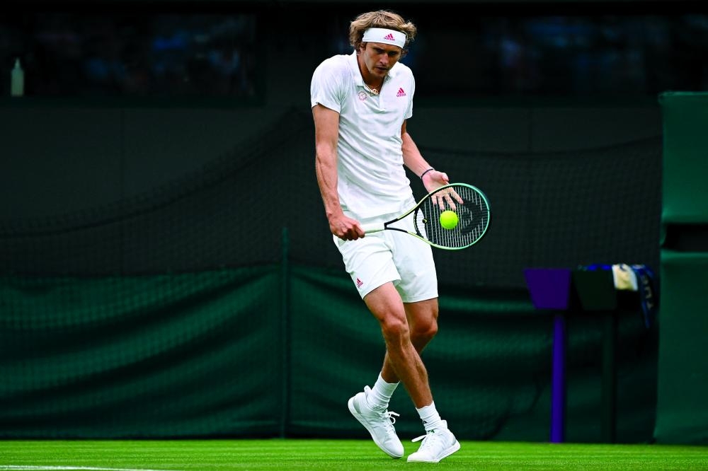 الألماني ألكسندر زفيريف تصدى لكرة منافسه، الهولندي تالون جريكسبور خلال مباراة الدور الأول للرجال الفردي في اليوم الثاني من بطولة ويمبلدون 2021 التي كسبها الأول.
