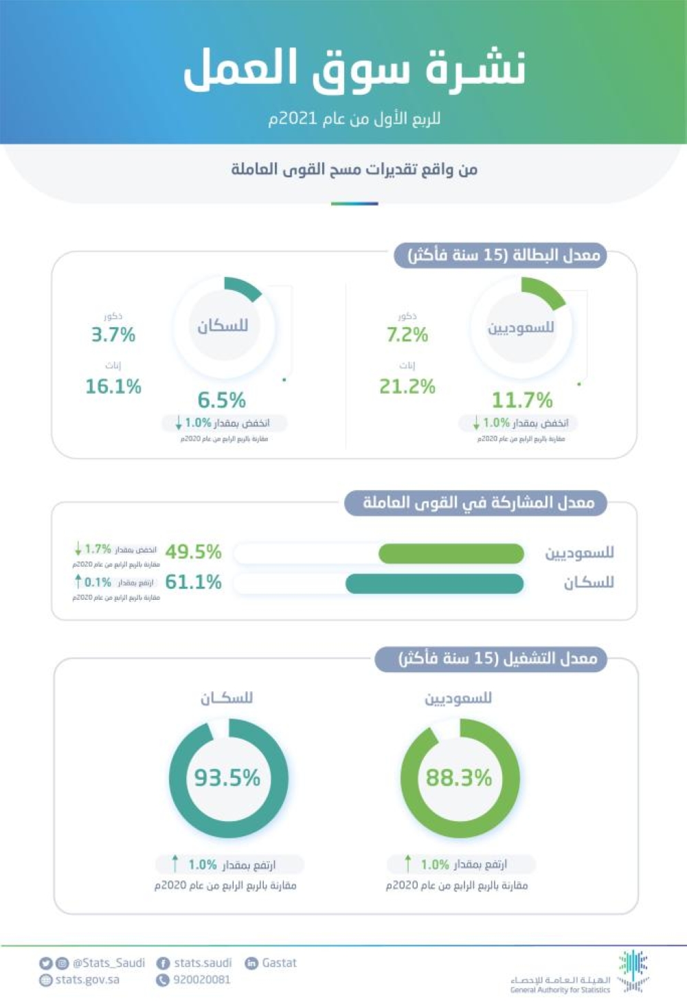 وانخفض معدل البطالة لإجمالي السكان في سن العمل (السعوديين وغير السعوديين 15 سنة فأكثر) لتصل إلى 6.5% مقارنة بنسبة 7.4% خلال الربع الرابع من عام 2020.