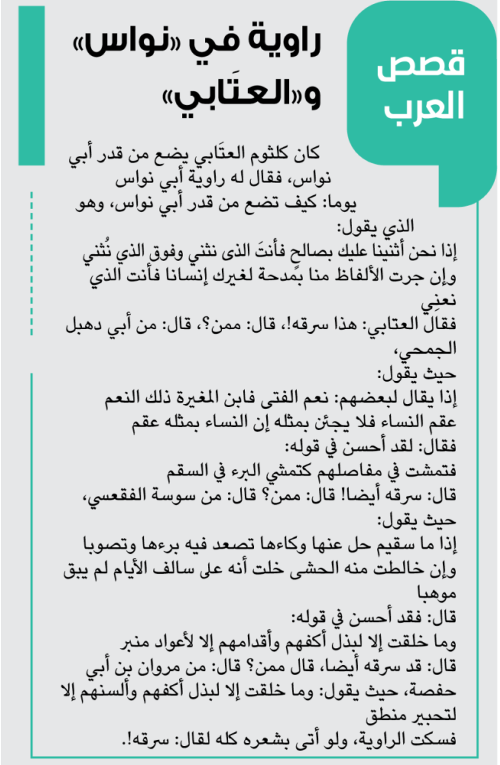 فقال العتابی: هذا سرقه!، قال: ممن؟، قال: من أبی دهبل الجمحی،