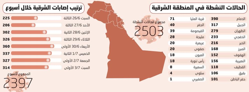 وأظهرت خريطة الإصابات ظهور 22 مدينة وبلدة بالمنطقة الشرقية ضمن سجل الإصابات اليومية خلال الأسبوع الأخير، ما أعاد أغلب مناطق المنطقة الشرقية لتسجيل حالات نشطة من جديد، حيث سجلت مدينة الدمام أعلى معدل للحالات النشطة بـ390 حالة، تلتها الجبيل 317 والظهران 279، والخفجي 233، والخبر 216، في حين تكررت مدن وبلدات محافظة الأحساء لتسجل المبرز 168 حالة نشطة والهفوف 152، والنعيرية 156، وبقيق 106، والجفر 40، والعيون 18، وسلوى 4، كما سجلت القطيف 118، وحفر الباطن 101، وقرية العليا 71، والقيصومة 39، ومليجة 28، وعريعرة 20، وصفوى 20، ورأس تنورة 18، والسعيرة 8، والصفيري 1.