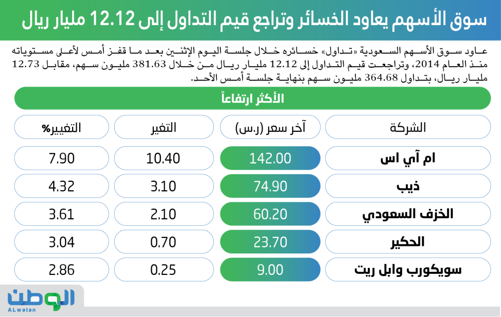 وشملت قائمة الأسهم الخاسرة 125 سهما، تصدرها سهم المتحدة للتأمين بتراجع 3.58%، بينما أغلق 62 سهما باللون الأخضر بصدارة سهم «المعمر» الذي صعد 7.9%. وسجل سهم «ذيب» أعلى قيمة تداول بنحو 680.7 مليون ريال، فيما تصدر سهم «لازوردي» الأعلى من حيث الكميات بـ58.12 مليون سهم.
