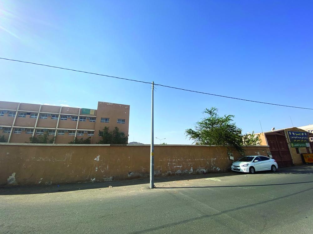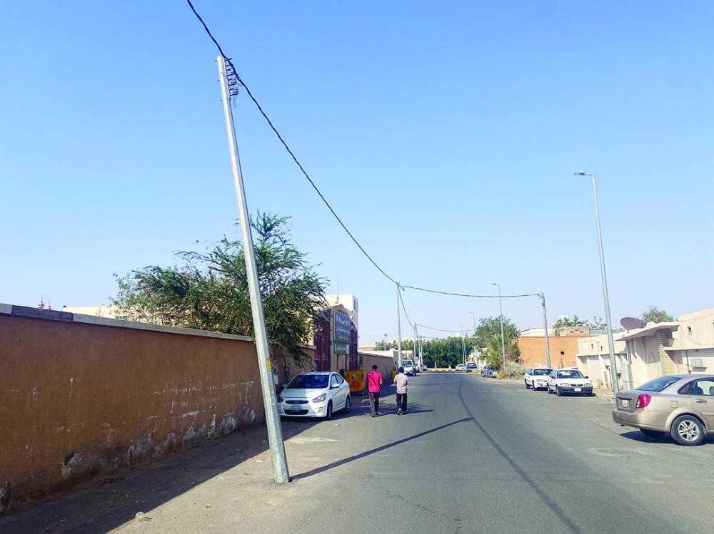 يشكل عمود كهربائي مائل في «فيصلية نجران» خطورة على المارين، لتوقع سقوطه في أية لحظة، فضلا عن الخوف من اصطدام السيارات به، حيث إنه يدخل ضمن حرم الطريق. (تصوير: أحمد بالحارث)