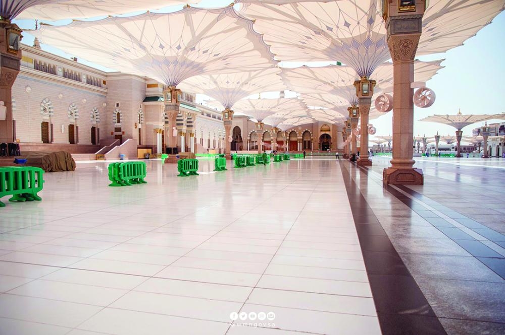 436 مروحة رذاذ تغطي ساحات المسجد النبوي لتخفيف درجة الحرارة، وتخضع شبكة مياه الرذاذ المركزية للتعقيم المستمر لضمان جودة المياه وخلوها من البكتيريا، ويعد النظام الأمثل لترطيب الهواء الخارجي.