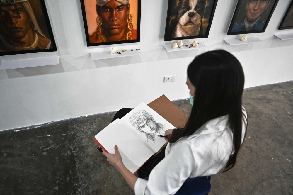 الفنانة التايلاندية جينيفا نيفاسابوت وهي ترسم أمام صور زيتية لشخصيات أنيمي شهيرة، في معرضها The 2D AfterliFe في بانكوك. (أ ف ب)