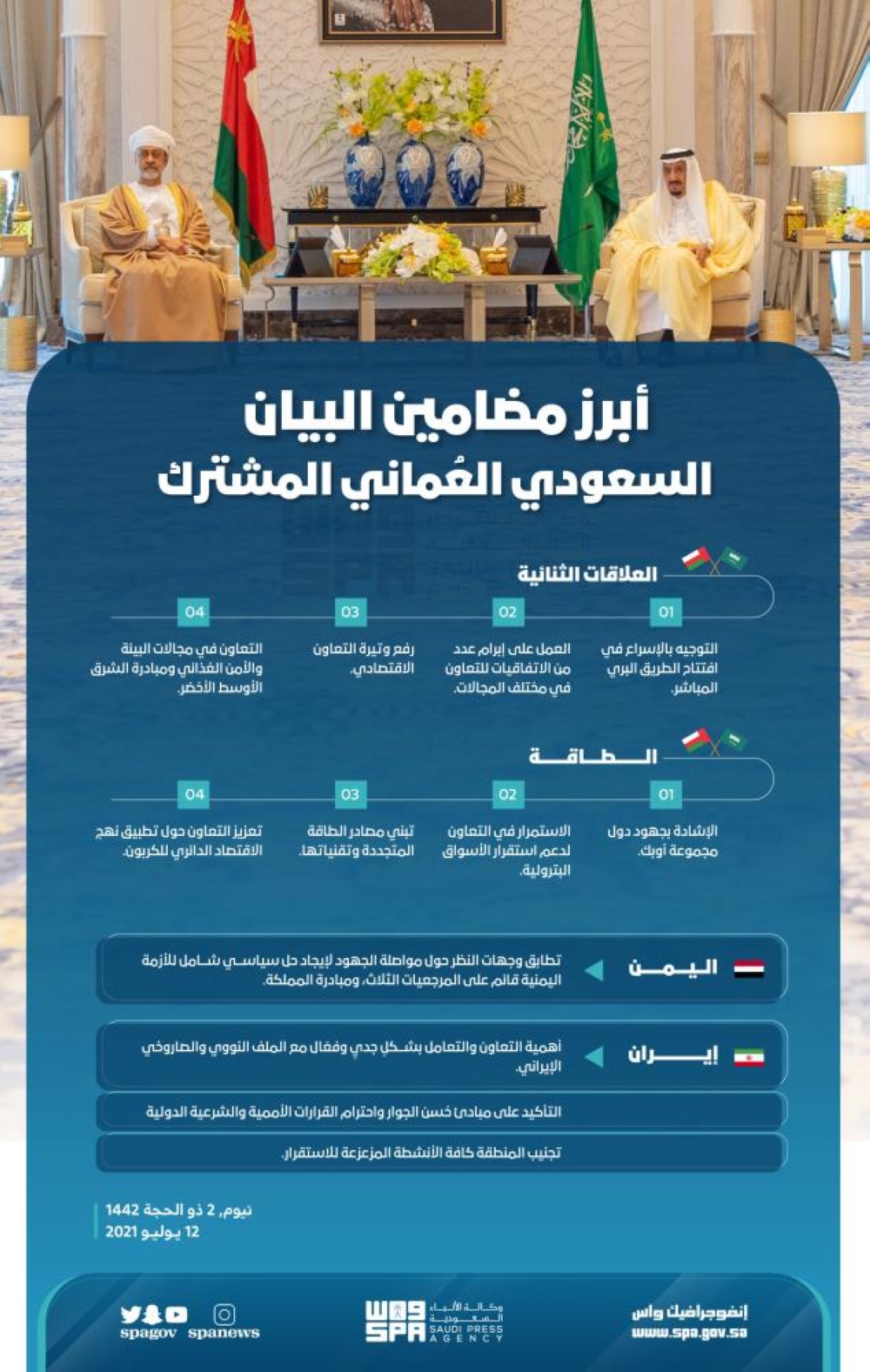 انطلاقاً من الروابط والوشائج الأخوية الراسخة والتاريخية التي تجمع بين قيادتي المملكة العربية السعودية وسلطنة عُمان، وبين شعبيهما الشقيقين، وتعزيزاً للعلاقات الثنائية المتميزة بينهما، واستجابة لدعوة كريمة من خادم الحرمين الشريفين الملك سلمان بن عبدالعزيز آل سعود ملك المملكة العربية السعودية، قام السلطان هيثم بن طارق، سلطان عُمان بزيارة دولة إلى المملكة العربية السعودية يومي 1 و2 / 12 / 1442هـ الموافق 11 و 12 / 7 / 2021.