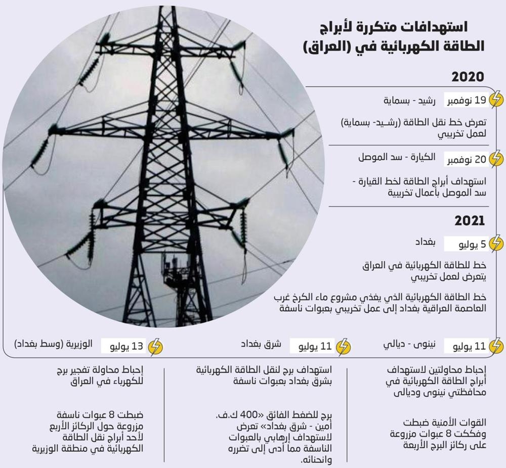 في حين تجددت الأعمال التخريبية ضد منشآت الطاقة والكهرباء، حيث أعلنت خلية الإعلام الأمني، إحباط عملية تفجير لأحد أبراج نقل الطاقة الرئيسة التي تربط العاصمة بغداد ومحطة القدس بين محافظتي ديالى وبغداد، موجهة أصابع الاتهام إلى تنظيم داعش الإرهابي.