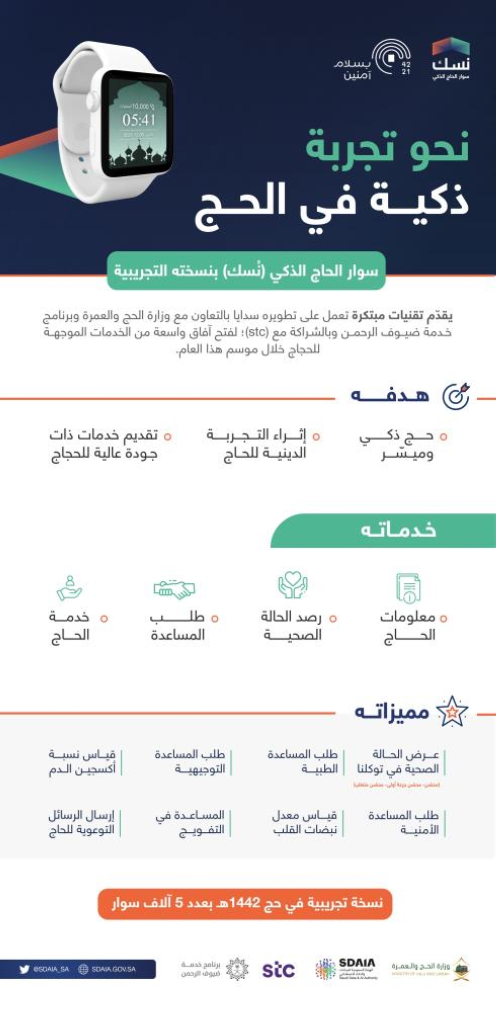 ويقدم سوار الحاج الذكي "نسك"، الذي يطرح لأول مرة على مستوى السعودية في نسخته التجريبية حيث سيتم توزيع 5 آلاف سوار على الحجاج، خدمات رئيسة تشمل توفير كامل المعلومات حول الحاج، والحالة الصحية (محصن، محصن جرعة أولى، محصن متعافٍ) ومتابعة ورصد بيانات الحالة الصحية المتعلقة بقياس نسبة أكسجين الدم ونبضات القلب، وخدمات طلب المساعدة الأمنية أو الطبية الطارئة؛ مما يسهم في سرعة الوصول إلى موقعة ومساعدته، كما سيتم إرسال رسائل توعوية للحجاج تصلهم عبر السوار، وغيرها من الخدمات لتقديم تجربة حج ميسرة للحجاج.