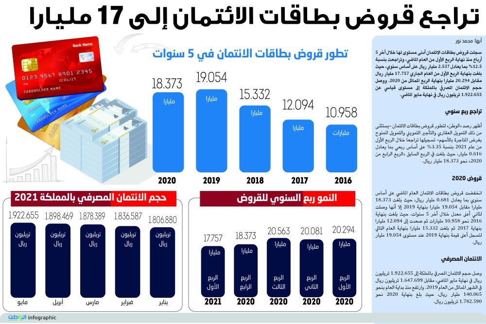 أظهر رصد «الوطن» لتطور قروض بطاقات الائتمان -يستثنى من ذلك التمويل العقاري والتأجير التمويلي والتمويل الممنوح بغرض المتاجرة بالأسهم- تسجيلها تراجعا خلال الربع الأول من عام 2021 بنسبة 3.35% على أساس ربعي بما يعادل 0.616 مليار، حيث بلغت في الربع السابق «الربع الرابع من 2020» نحو 18.373 مليار ريال.