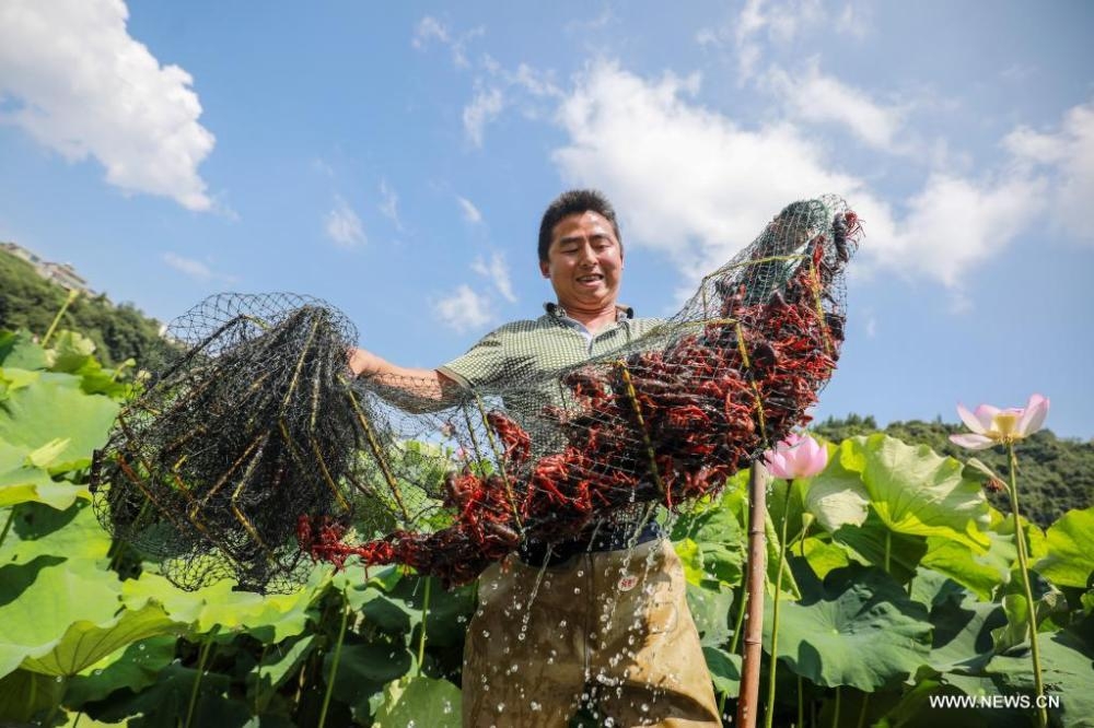 مزارع يصطاد «جراد البحر» من حوض لزهور اللوتس في جنوب غربي الصين، حيث شجعت بلدة «تشينجشويبو» على ذلك، لزيادة فرص العمل والدخول للمزارعين المحليين. (شينخوا)