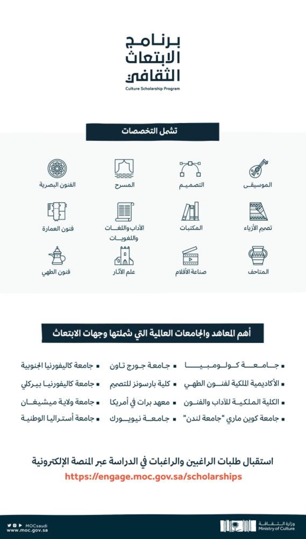 ويأتي برنامج الابتعاث الثقافي بوصفه واحداً من مبادرات وزارة الثقافة الرامية إلى توفير خيارات تعليمية عالية الجودة في التخصصات الفنية والثقافية، وبما يضمن تأهيل كوادر محلية قادرة على مواكبة مشروع النهوض بالقطاع الثقافي المحلي. والبرنامج مستمر في استقبال طلبات الراغبين والراغبات في الالتحاق به عبر منصته الإلكترونية https://engage.moc.gov.sa/scholarships، وتقدم الوزارة من خلال البرنامج دعماً للمقبولين والمقبولات يشمل تحمّل البرنامج لكافة تكاليف الدراسة، والضمان المالي، ومصاريف المعيشة للمبتعث ومرافقه، بالإضافة للرعاية الصحيّة، وتذاكر السفر من المملكة إلى مقرِّ البعثة والعكس، مع تقديم برامج إرشاديّة تُركّز على متابعة المبتعث وتقييم تطوّره الأكاديمي.