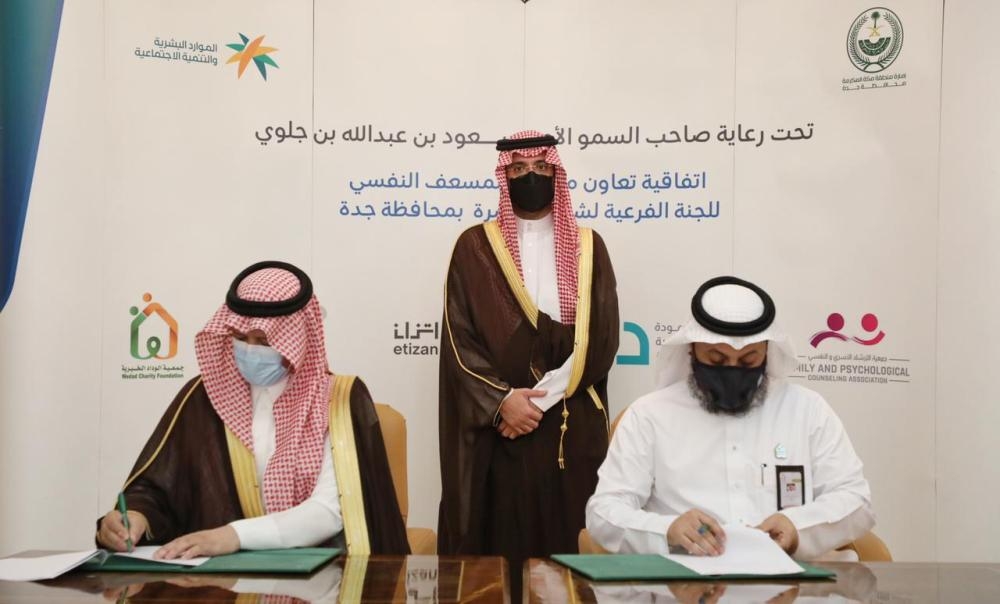 ووقع المذكرة فهد بن رقوش رئيس اللجنة الفرعية لشؤون الأسرة بمحافظة جدة مدير عام فرع وزارة الموارد البشرية والتنمية الاجتماعية بمنطقة مكة المكرمة، مع كلٍ من جزاء بن مرزوق المطيري رئيس مجلس إدارة جمعية الإرشاد الأسري و النفسي، ومحمد آل رضي المدير العام لجمعية المودة للتنمية الأسرية وضيف الله الحقوي المدير العام لجمعية رعاية الأيتام، وعبدالله السيود المدير التنفيذي لجمعية مراكز الأحياء بجدة، ونجلاء الثقفي المدير العام لمركز إتزان.