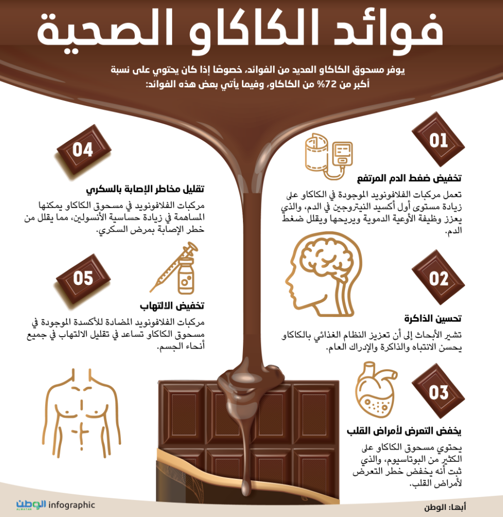 تعمل مركبات الفلافونويد الموجودة في الكاكاو على زيادة مستوى أول أكسيد النيتروجين في الدم، والذي يعزز وظيفة الأوعية الدموية ويريحها ويقلل ضغط الدم.
