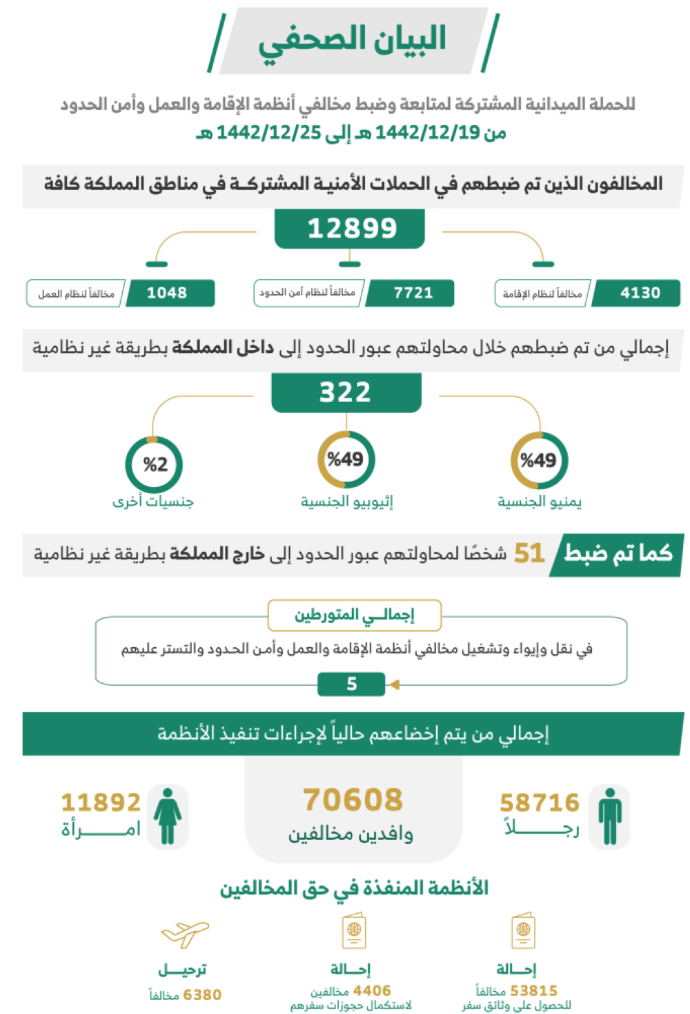 أولاً: بلغ إجمالي المخالفين الذين تم ضبطهم بالحملات الميدانية الأمنية المشتركة في مناطق المملكة كافة (12899) مخالفًا، منهم (4130) مخالفًا لنظام الإقامة، و(7721) مخالفًا لنظام أمن الحدود، و(1048) مخالفًا لنظام العمل.