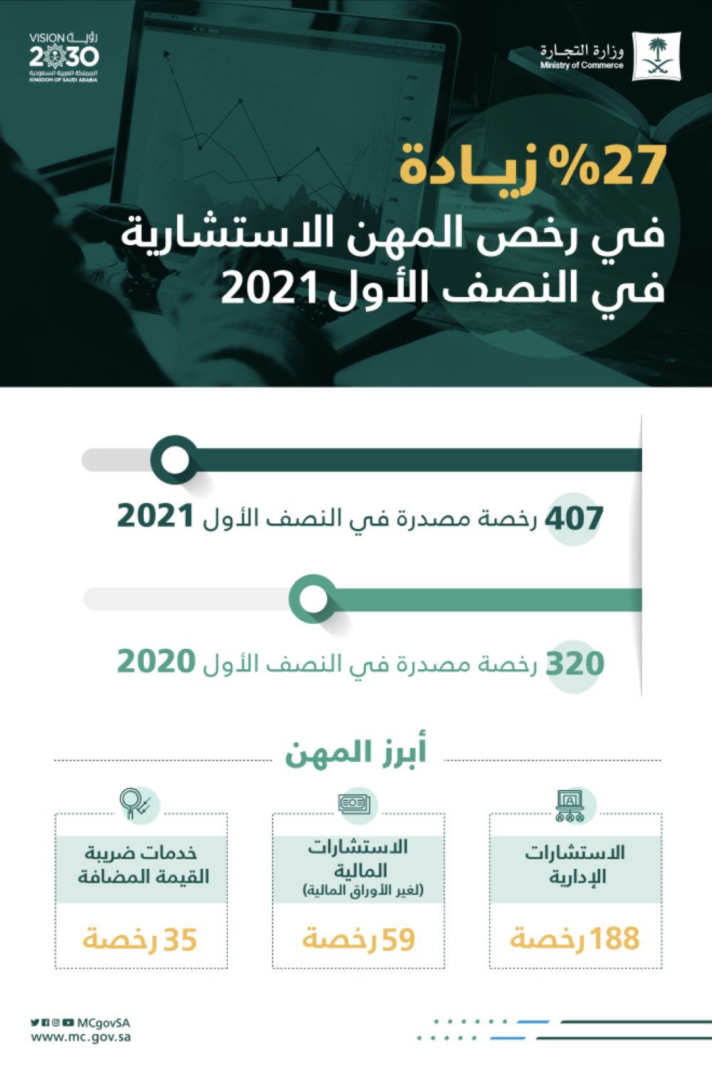 وتصدرت الاستشارات الإدارية قائمة المهن الأعلى طلباً في النصف الأول من العام 2021 بواقع 188 رخصة، تلتها الاستشارات المالية (لغير الأوراق المالية) بواقع 59 رخصة، ثم خدمات ضريبة القيمة المضافة بواقع 35 رخصة.